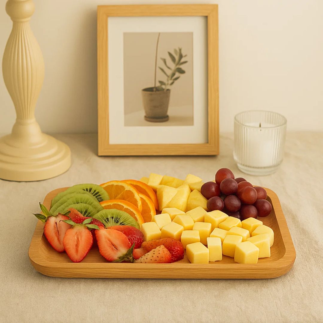 Đĩa gỗ hình chữ nhật được chế tác thủ công từ gỗ tự nhiên, mang vẻ đẹp mộc mạc, sang trọng và bền bỉ. Với dáng dài thanh thoát và các góc bo mềm mại, sản phẩm vừa tiện dụng cho bày biện món ăn, vừa là món decor tinh tế trên bàn ăn, bàn trà hay quầy bếp. Vân gỗ độc đáo cùng màu sắc ấm áp đem lại cảm giác gần gũi, ấm cúng cho mọi không gian.