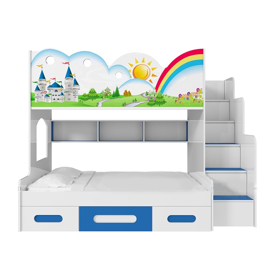 - Thiết kế hiện đại với 2 tầng giường có kích cỡ khác nhau, tầng trên nhỏ hơn về chiều rộng. Tầng trên có lan can chắn cao đảm bảo an toàn cho các bé khi ngủ.