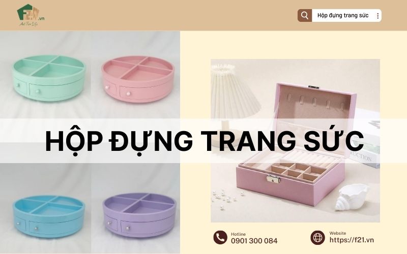 Dù để lưu giữ những món trang sức quý giá hay làm điểm nhấn trang trí cho bàn trang điểm, hộp đựng trang sức luôn mang đến sự tinh tế và vẻ đẹp riêng. Không chỉ giúp sắp xếp ngăn nắp, sản phẩm còn là cách bạn thể hiện sự trân trọng với từng món phụ kiện. Nếu bạn đang tìm kiếm một chiếc hộp đựng trang sức đẹp, hãy liên hệ ngay với F21 để được tư vấn miễn phí.