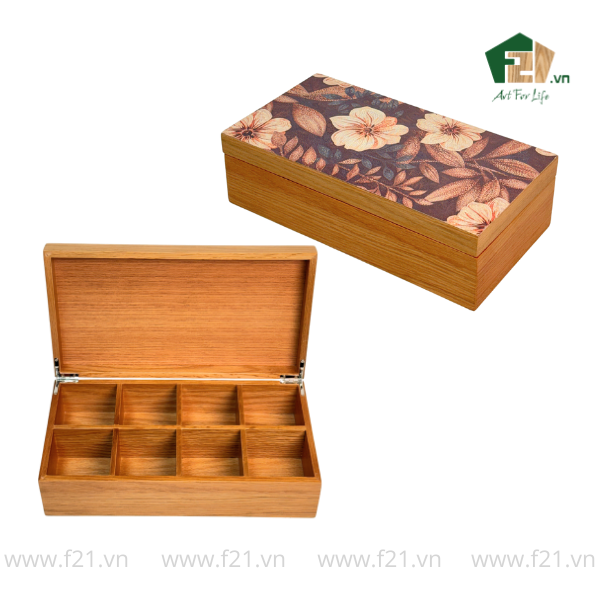 Hộp trà chữ nhật nắp bản lề bướm – vẻ đẹp tinh tế của gỗ tự nhiên, hòa cùng hơi thở nghệ thuật hiện đại. Sản phẩm được chế tác tỉ mỉ từ gỗ cao cấp với vân gỗ mịn màng, phối cùng mặt nắp in hoa văn sang trọng, tạo nên tổng thể hài hòa, tự nhiên và đậm chất decor. Thiết kế chia 8 ngăn nhỏ tiện lợi, giúp không gian bàn trà trở nên ngăn nắp, sang trọng và tinh tế hơn bao giờ hết.