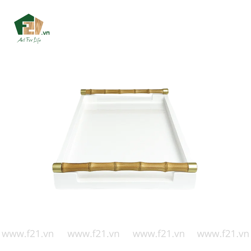 + Tay cầm tre dài bằng chiều rộng khay, đầu bọc 2 núm kim loại phun nhũ vàng.