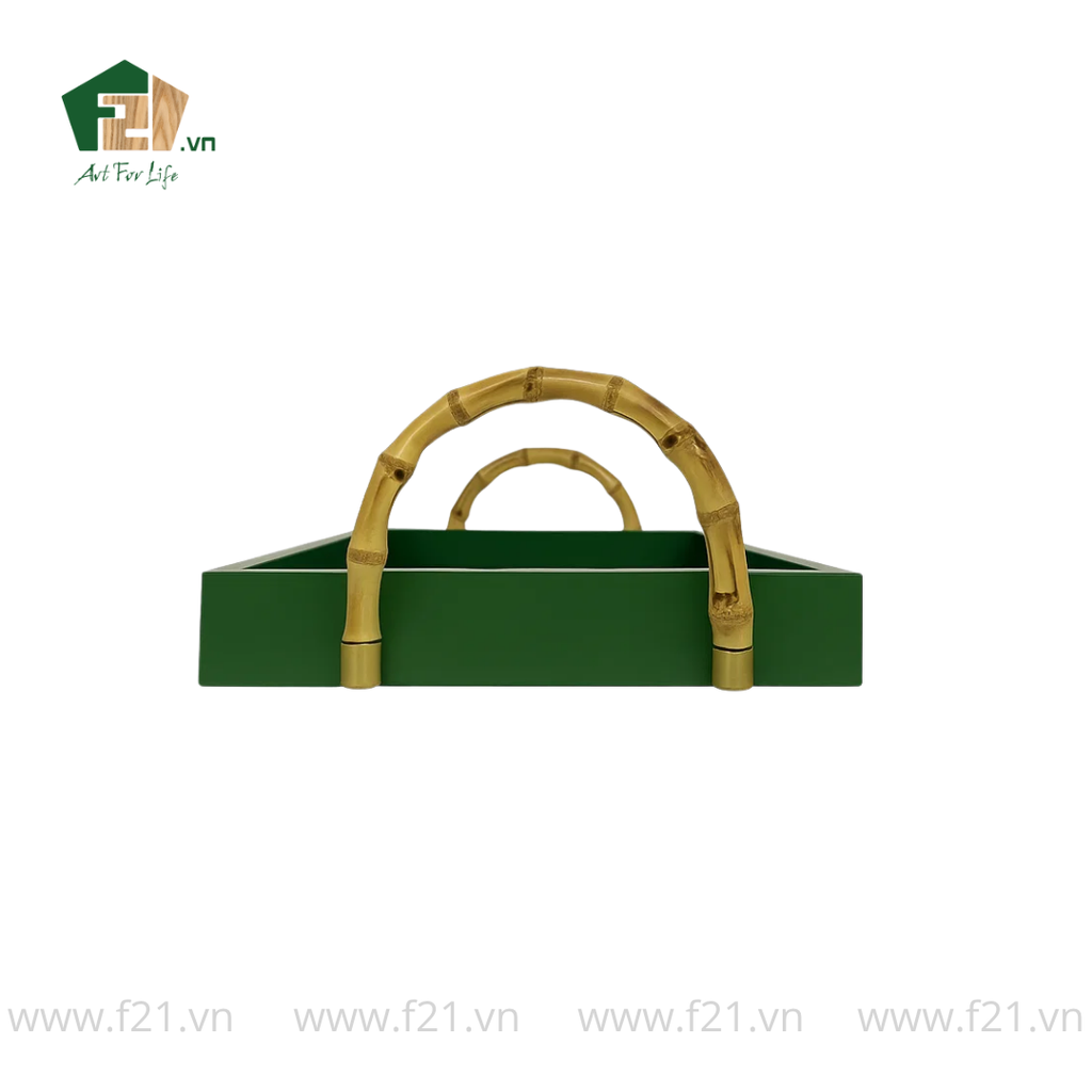 Khay chữ nhật có tay cầm tre sơn mài mang phong cách sang trọng và hiện đại, kết hợp giữa chất liệu gỗ phủ sơn mài bóng mịn và tay cầm tre tự nhiên độc đáo. Thiết kế chắc chắn, tiện dụng, vừa dùng để phục vụ đồ ăn, vừa là món decor tinh tế cho không gian sống.
