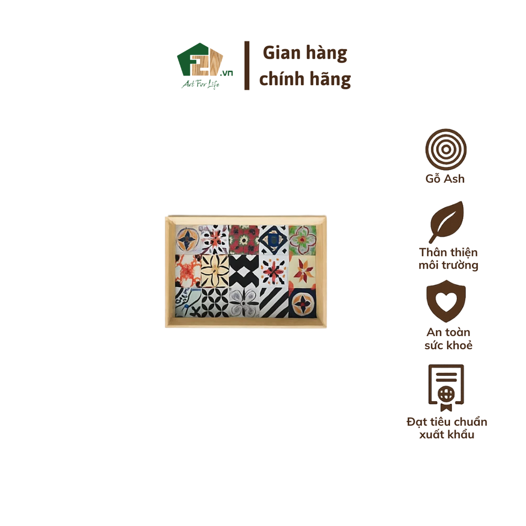 Khay gỗ in họa tiết hoa văn được sản xuất theo tiêu chuẩn xuất khẩu bởi Công ty TNHH Mỹ Nghệ và Nội Thất F21. Được chế tác thủ công tỉ mỉ, kết hợp nền gỗ tự nhiên bền đẹp với mặt khay phủ sơn mài bóng mịn. Bề mặt khay được trang trí bằng các ô họa tiết gạch bông cổ điển nhiều màu sắc, mang hơi thở của kiến trúc xưa, tạo nên vẻ đẹp vừa hoài niệm vừa độc đáo.